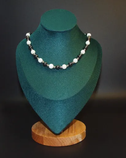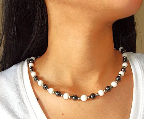 Discover serene elegance and pure energy in our handcrafted white agate and hematite necklace. Each white agate bead glows with a gentle, calming light, symbolizing clarity and inner peace. Paired with grounding hematite stones, this necklace offers a perfect balance of protection and elegance. With subtle stainless steel accents, it not only adorns you, but also resonates in harmony with your well-being and spirituality. At GUACA, we believe in jewelry that truly vibrates with you. This necklace measures 18 inches in length.