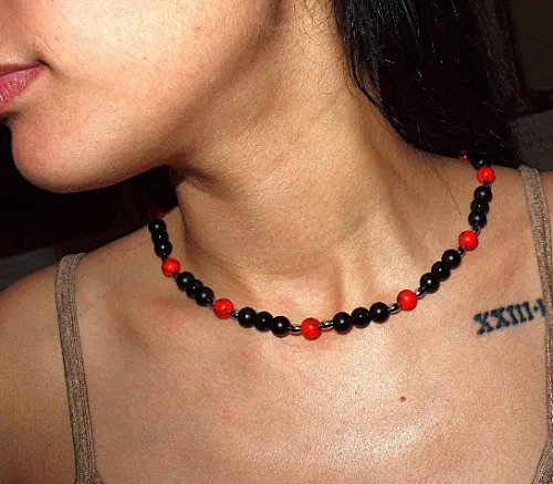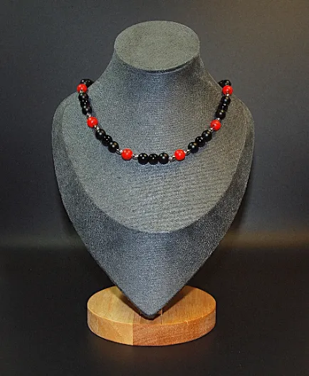 Discover a unique women’s necklace that harmonizes vibrant energy with elegant style. This handcrafted piece features striking red turquoise stones, deep black onyx beads, and sleek black agates, all accented with stainless steel accents. Each stone is chosen to resonate with grounding and protective energies, creating a piece that not only looks bold but also feels empowering.
