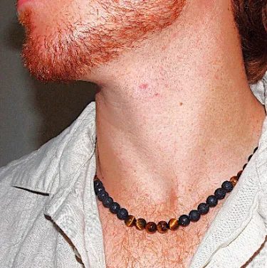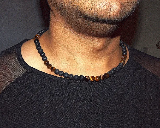 Let the protective and grounding essence of tiger eye lead the way in this powerful piece, complemented by the ancient energy of volcanic stones. This 20-inch necklace is designed to harmonize your inner strength and spiritual stability, making it an ideal piece for men who seek both style and a deeper connection to the earth.